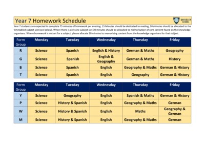 Homework Schedules Years 7-11